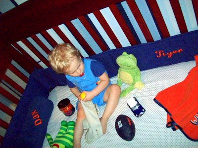 12. Getting up to tinkle in the middle of the night only to have the living nightlights scarred out of me by a door swung open by a baby announcing his presence with "H-AAAA-Y" while holding every toy his little arms could carry and running to climb on me just to get comfortable and fall asleep on my lap while I'm sitting on the throne. How did this strange situation come about and what's up with all the toys you might ask? Dax has been going through a phase in which he must sleep as close to me as he can if not on me. Of course this is uncomfortable and keeps me up so when he's in deep sleep I'll sneak out of the bed and go get on the couch. This particular night he'd woke up and followed me to the couch. 30 mins after he'd fallen asleep on the couch I got up to use the bathroom and much to my surprise he actually followed me in there. It's kind of sweet actually. I dare not complain because I know I'll miss this one day!! So, what's up with all the toys??? Well, Dax is slowly turning his crib into a toy box. The list of things he requires to get settled for a good night's rest are as follows:
