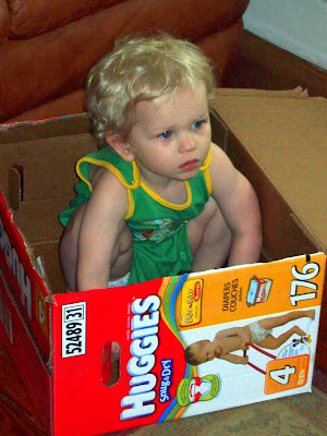 I knew keeping all those empty diaper boxes would come in handy one day. I used these to put our large DVD collection for sale in. This occupied D for about an hour too.